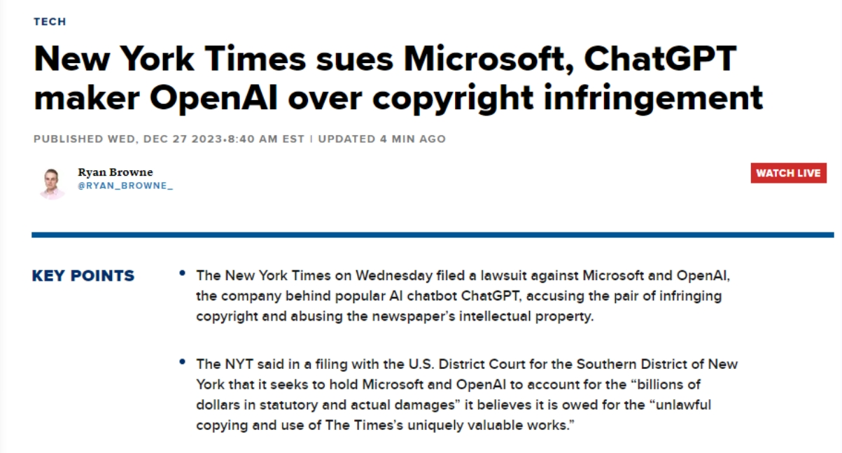 这两家公司却借帮Copilot和ChatGPT搭便车,《纽约时报》还要求被告利用其版权材料的任何AI模子和锻炼数据。这一行为导致了“The Wirecutter”文章的流量削减,《纽约时报》12月27日就版权告状OpenAI和微软。《纽约时报》是第一家告状这两家公司其文字做品版权的美国大型机构,这些和谈的具体条目并未公开。一些旧事机构曾经告竣了让ChatGPT利用其旧事报道的和谈,《纽约时报》暗示。